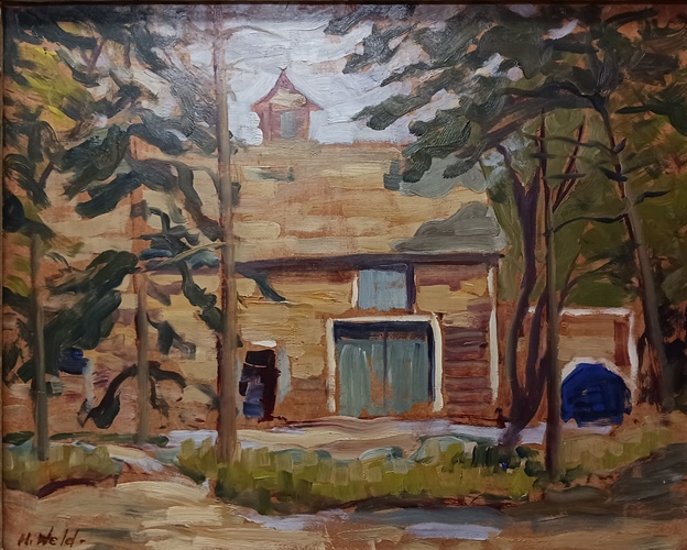 - Old Barn, oil, image 16″ x 20″, frame 21 3/4″ x 25 3/4″, signed H. Weld, $750.00