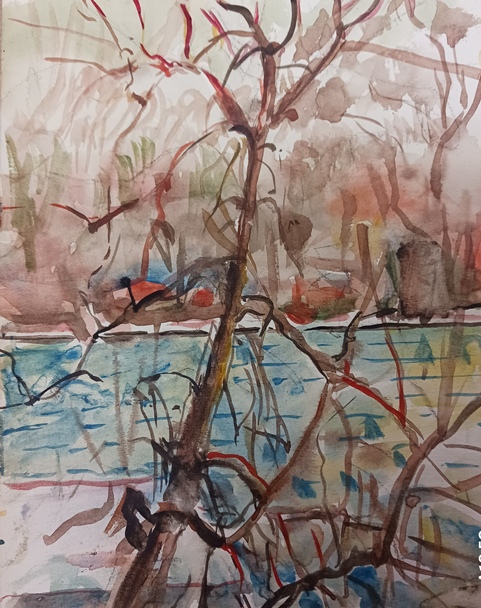 - Tree and river, watercolour, image 7 3/4″ x 6″, unsigned, attributed to Lucy Jarvis, $200.00
